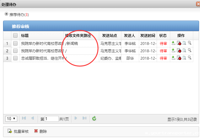 2、点击黄色按钮,可查看需要处理的“待办事项”,如下图(“接收文件夹路径”表示文章在那个文件夹,“/” 表示在根文件(新闻网)下, “/新闻稿”表示在“新闻稿”文件夹):