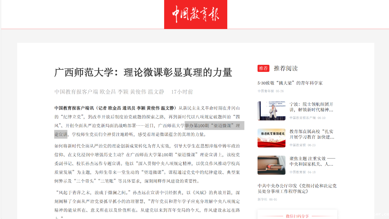 近日,《光明日报》《中国教育报》关注报道我校举办第100期“望道微课”理论宣讲。我校党委副书记、校长孙杰远作专题宣讲。孙杰远以“深入贯彻中央八项规定精神,以优良作风推动学校高质量发展”为主题,为师生带来一堂生动的望道微课。